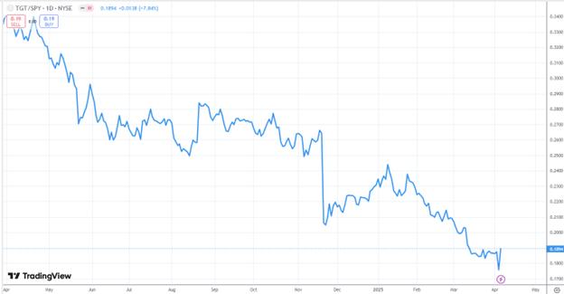Doing the same with TGT versus SPY confirms that TGT has poor relative strength due to the downward-sloping graph of their price ratios.