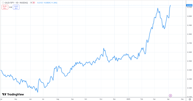 The price of GILD is getting bigger in relation to the price of SPY.