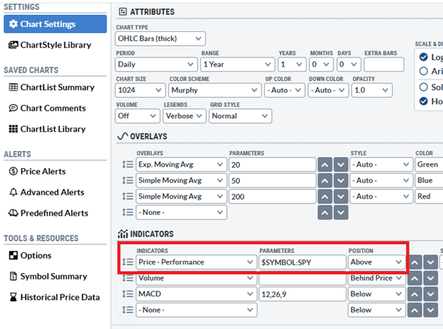 One can easily change it to SPY in the Parameters of the “Price Performance” indicator under Chart Settings…