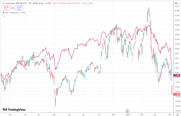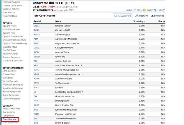 To figure out which stocks are on the IBD 50 list, you can look at the constituents of Innovator IBD 50 ETF (FFTY) on barchart.com