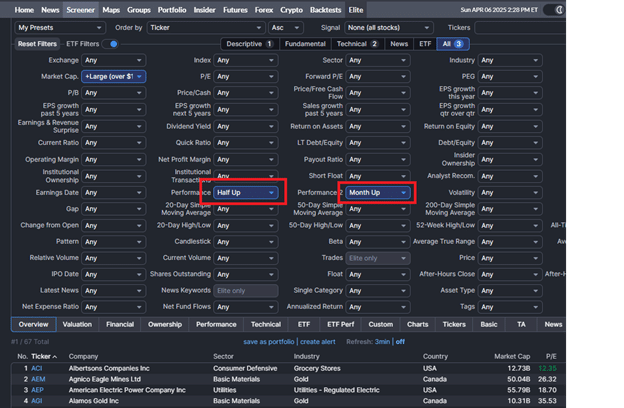 However, you can get a filtered list that is somewhat close by scanning for those stocks that are up in price in the past 6 months and also up the last month.