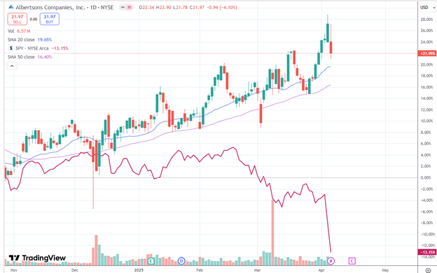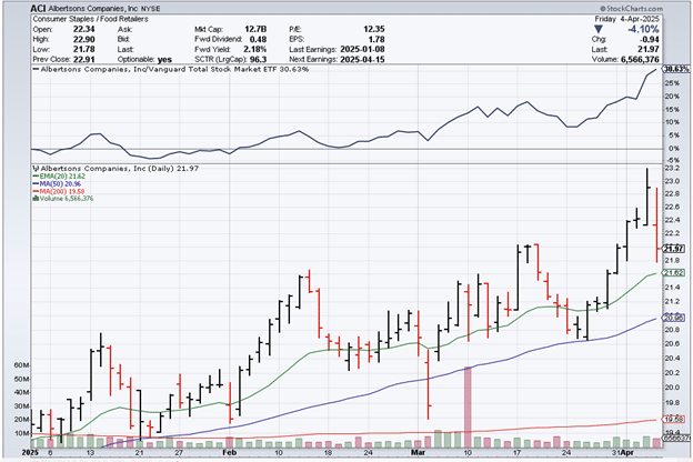 Albertson (ACI), the grocery store, is still in an uptrend with positively stacked upward-sloping moving averages while the rest of the market is dropping.