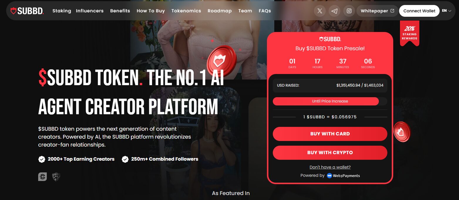 SUBBD positions as an AI token connecting blockchain to creator economies, offering smart contracts, automated revenue sharing and platform governance. The token grants VIP staking access and early access to beta features.