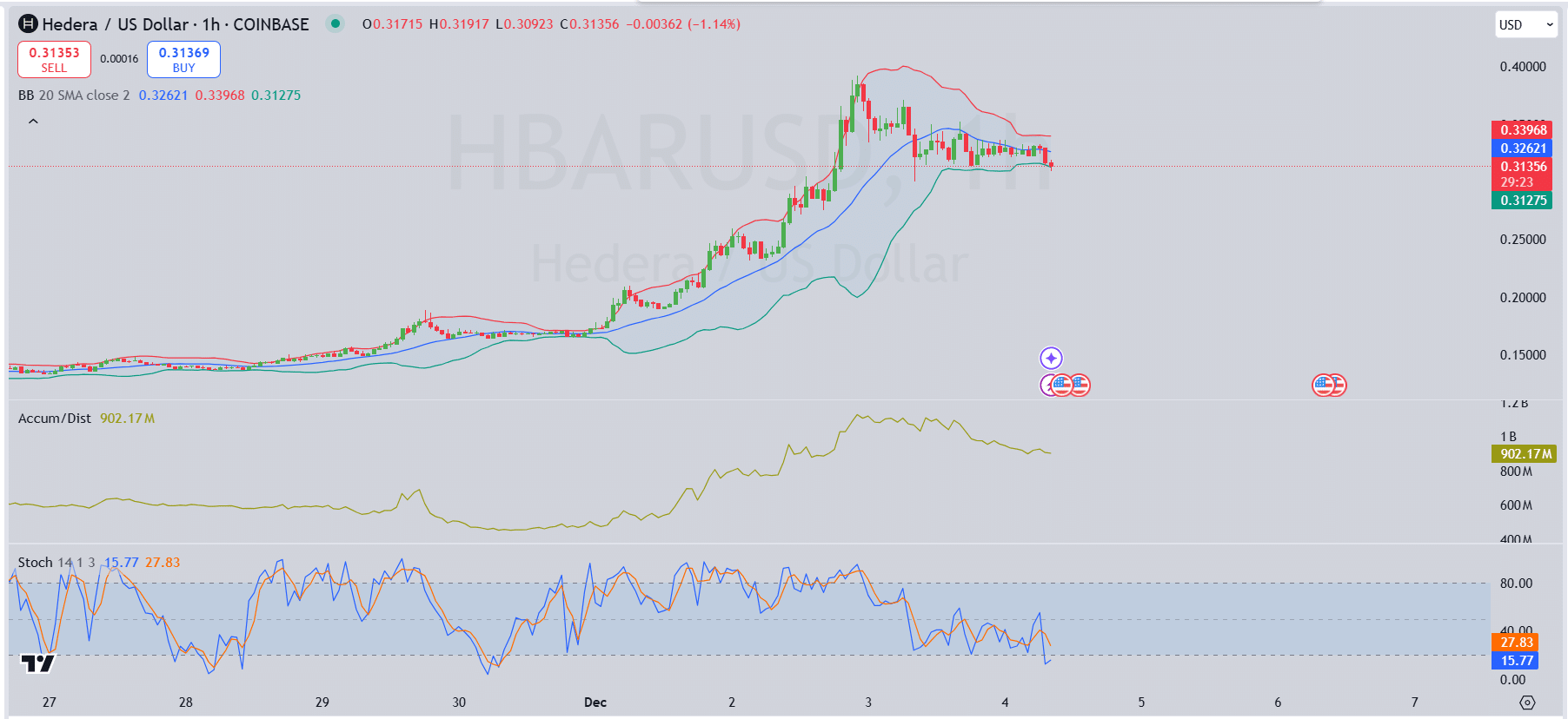 In fact, HBAR surged by 131.01% during its initial rally, climbing from $0.15 to $0.35. Following the rally, however, the price entered a flag-like consolidation phase, one defined by descending parallel trend lines – Often considered a bullish continuation pattern.