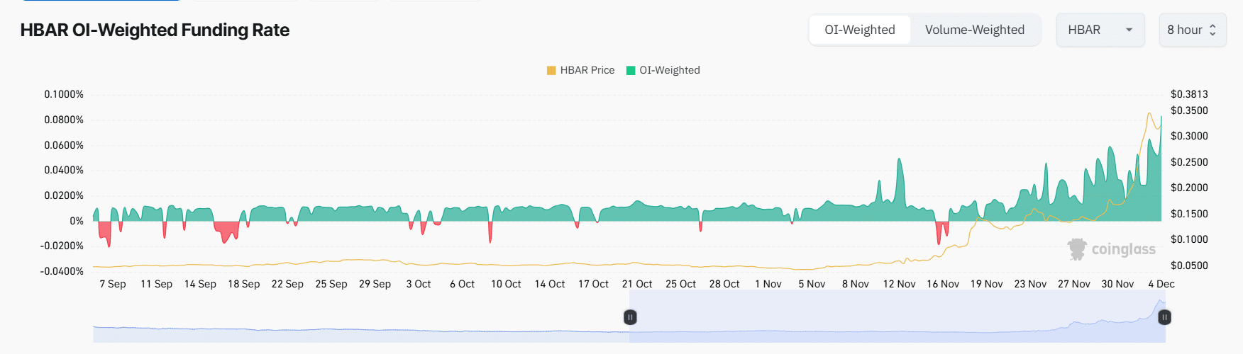 There has also been a consistent hike in HBAR’s OI-weighted funding rate, with the same peaking at around 0.08% as the price surged from $0.15 to over $0.30 in early December.