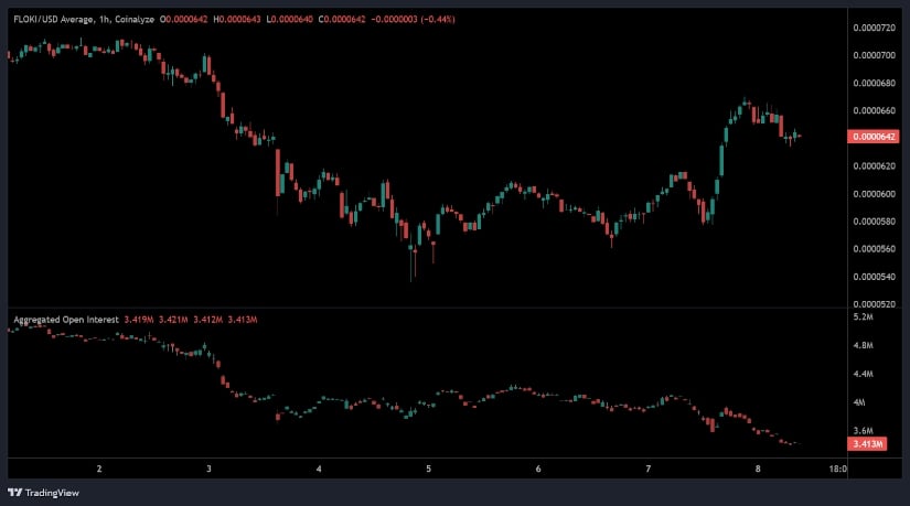 Floki Price Prediction discussions currently center on the recent decline in aggregated open interest (OI) as price movement stabilizes on the lower timeframes. On the 1-hour chart, OI decreased from approximately 3.42 million to 3.41 million, reflecting a gradual unwinding of leveraged positions. This shift occurred while the price was trending lower, suggesting that long positions were being closed as traders adjusted exposure after prior bullish momentum weakened.