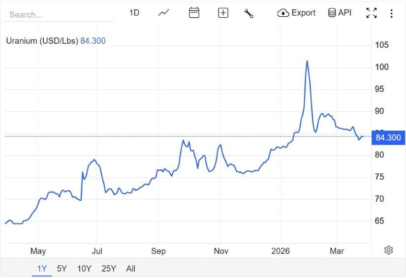 Meanwhile, the latest one-year uranium chart showed uranium at $84.30 per pound. That is below the spike above $100 seen earlier in 2026, but it remains well above the mid-$60s levels seen around the start of the year.