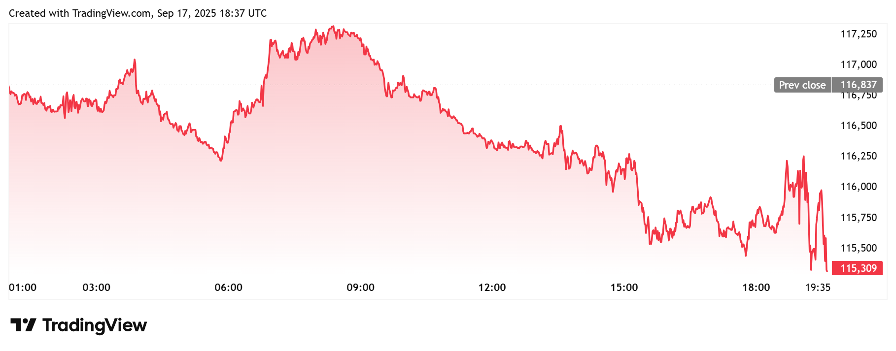 The Bitcoin price sharply dropped following the Fed rate cut decision. TradingView data shows that the flagship crypto dropped from around $116,000 and is currently trading at around $115,500.