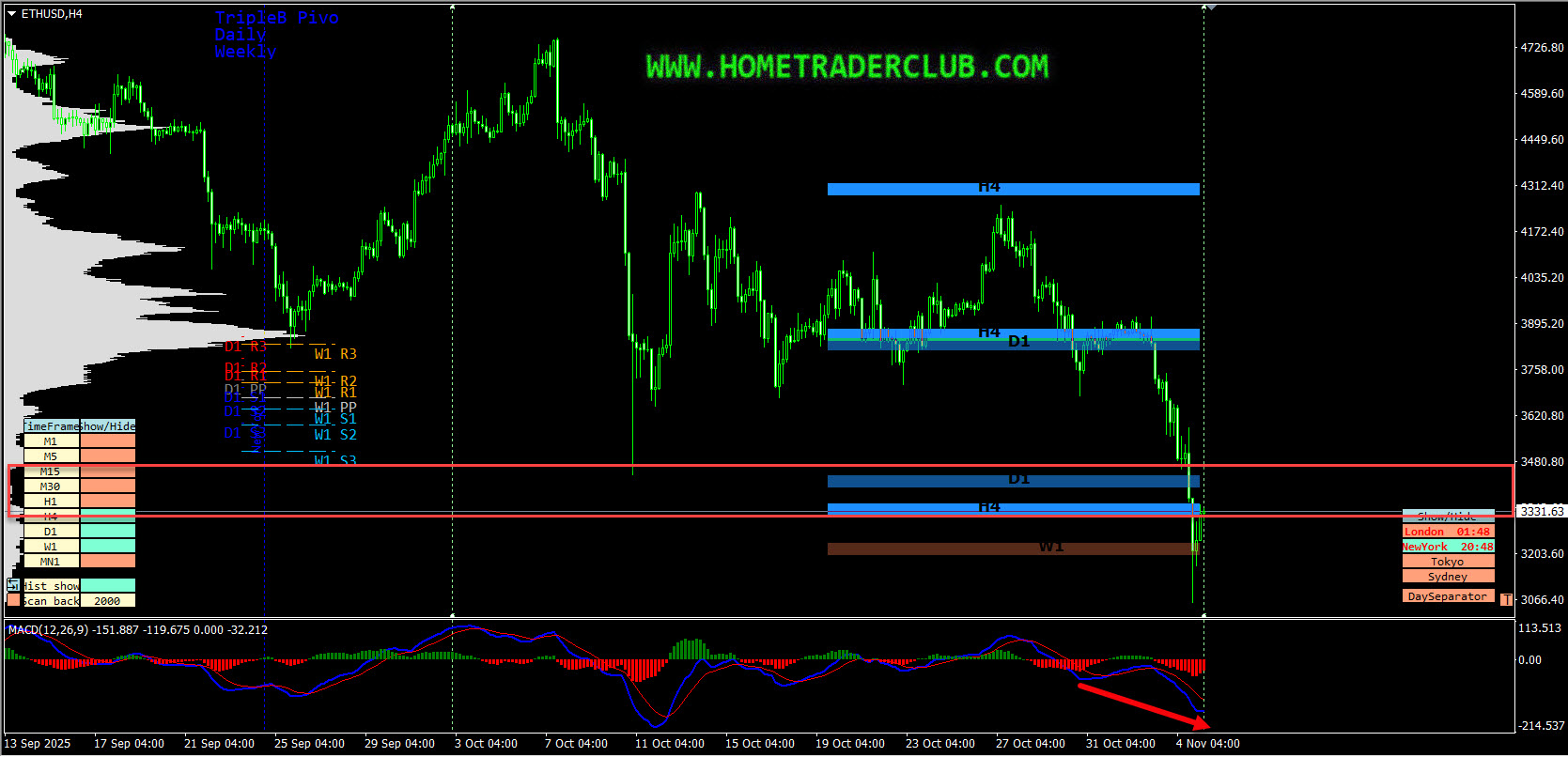 On the H4 chart, we could see that the price which is moving lower has created lower lows based on the MACD indicator which is a sign of gaining momentum toward the bearish side. In addition to this, the price which is moving lower has broken below a strong support zone formed based on the volume profile zones of the KTLI indicator and the Triple B Pro pivot levels and is currently holding below it, which we may consider as yet another evidence of bearish pressure. Also, currently there are no signs opposing this short term bearish view. We may now move down to lower timeframe and see if we can find evidences supporting this short term bearish view.