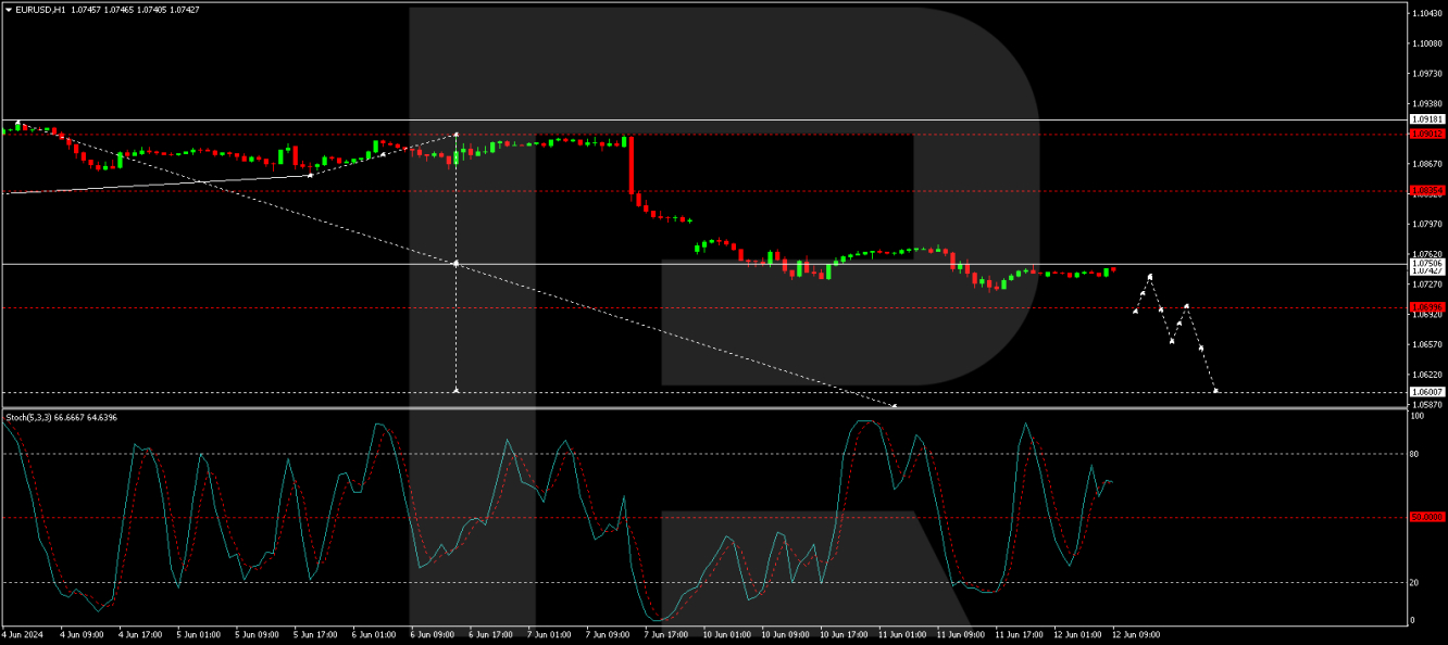 On the H1 chart, the consolidation range has expanded between 1.0773 and 1.0717. A movement towards 1.0750 is anticipated, with a forming trend continuation pattern suggesting a further drop. Exiting this range on the downside could initiate a movement towards 1.0600. The Stochastic oscillator, currently below 80, is expected to fall to 20, aligning with the potential for further declines.