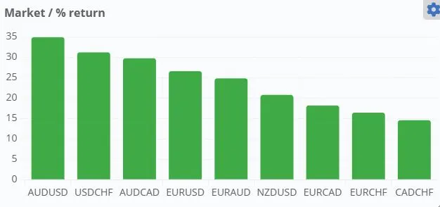 - The second chart reveals percentage returns across multiple currency pairs. Top-performing pairs like AUDUSD and USDCHF have delivered returns exceeding 30%, validating the strength of Edge-Forex strategies.