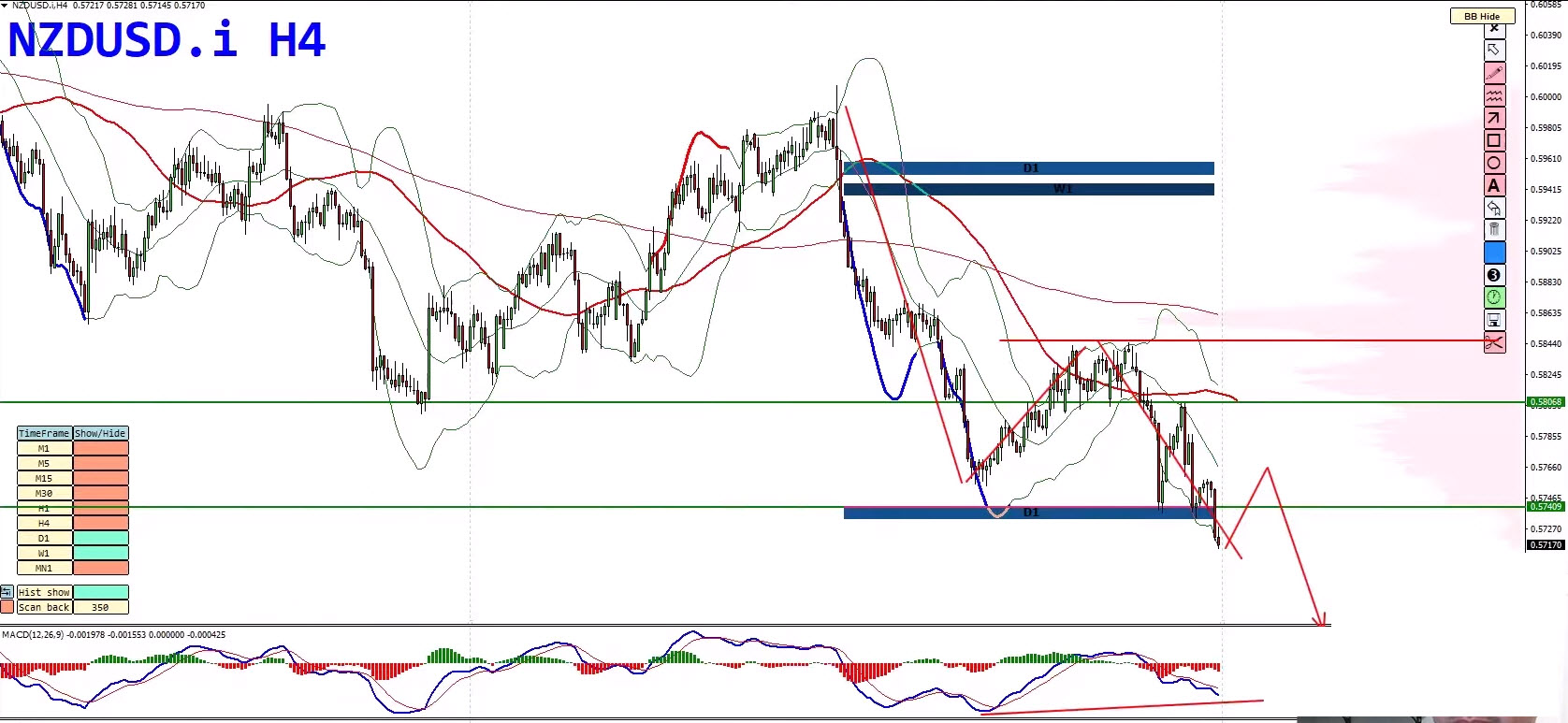 The New Zealand Dollar remains under strong bearish pressure, maintaining its lower highs and lower lows pattern. While the 4-hour chart shows a slight slowdown, the daily trend remains bearish.