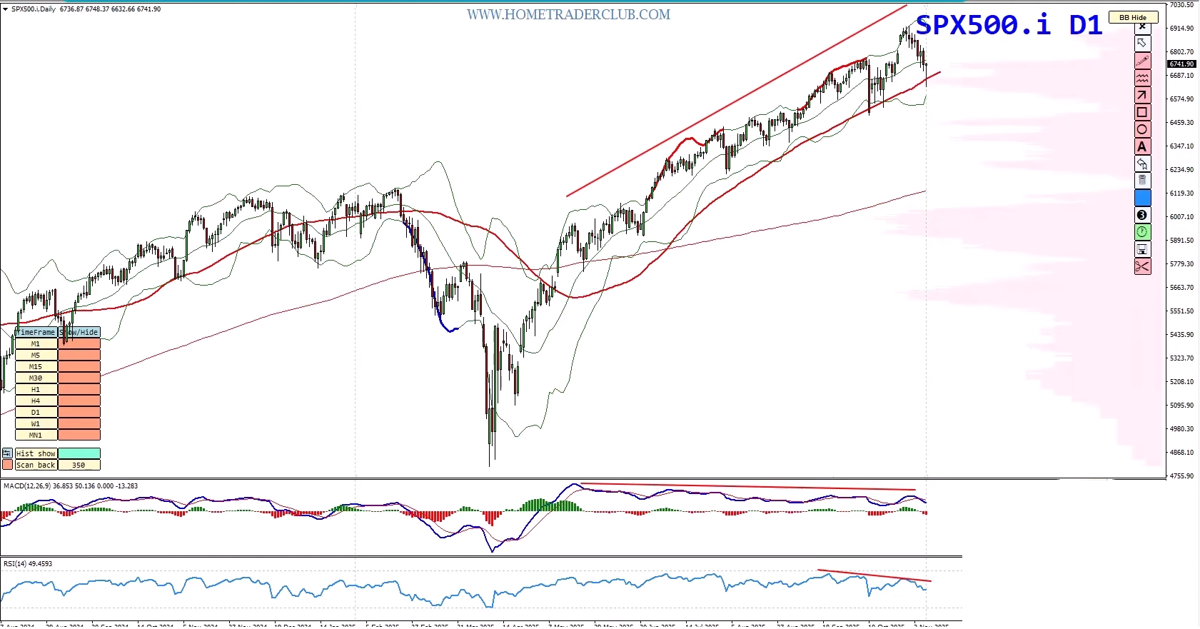 On the daily chart, we can observe bearish divergence: higher highs in price but lower highs in MACD and RSI, indicating momentum loss.