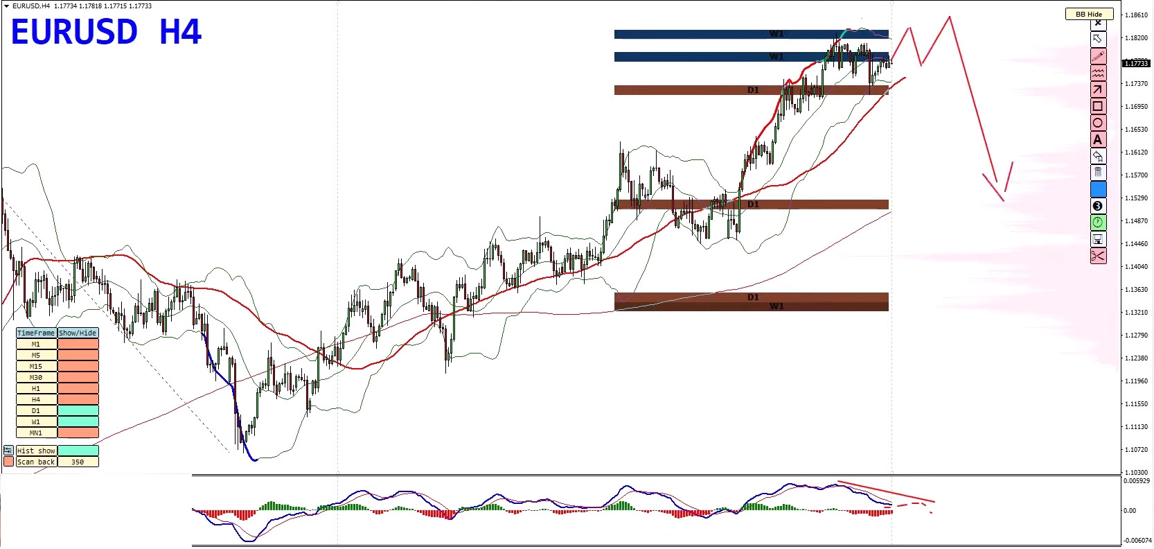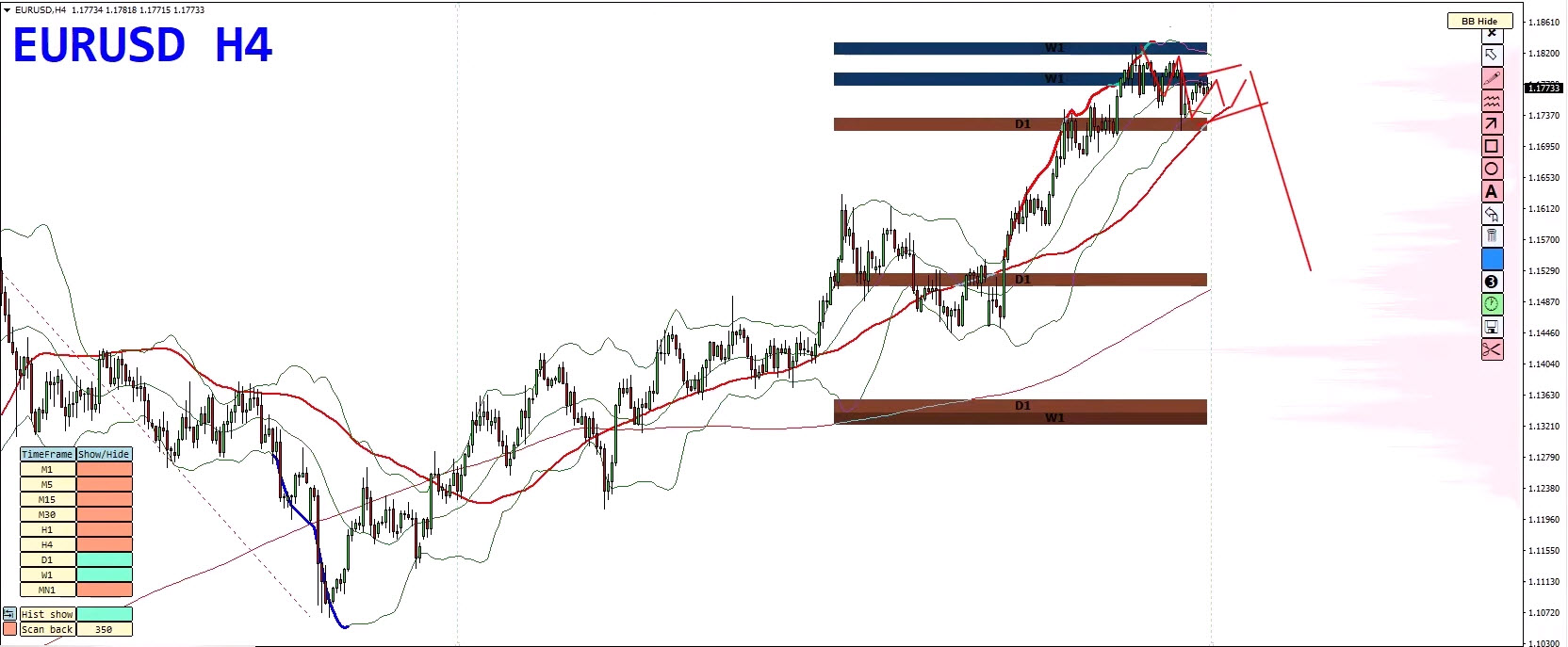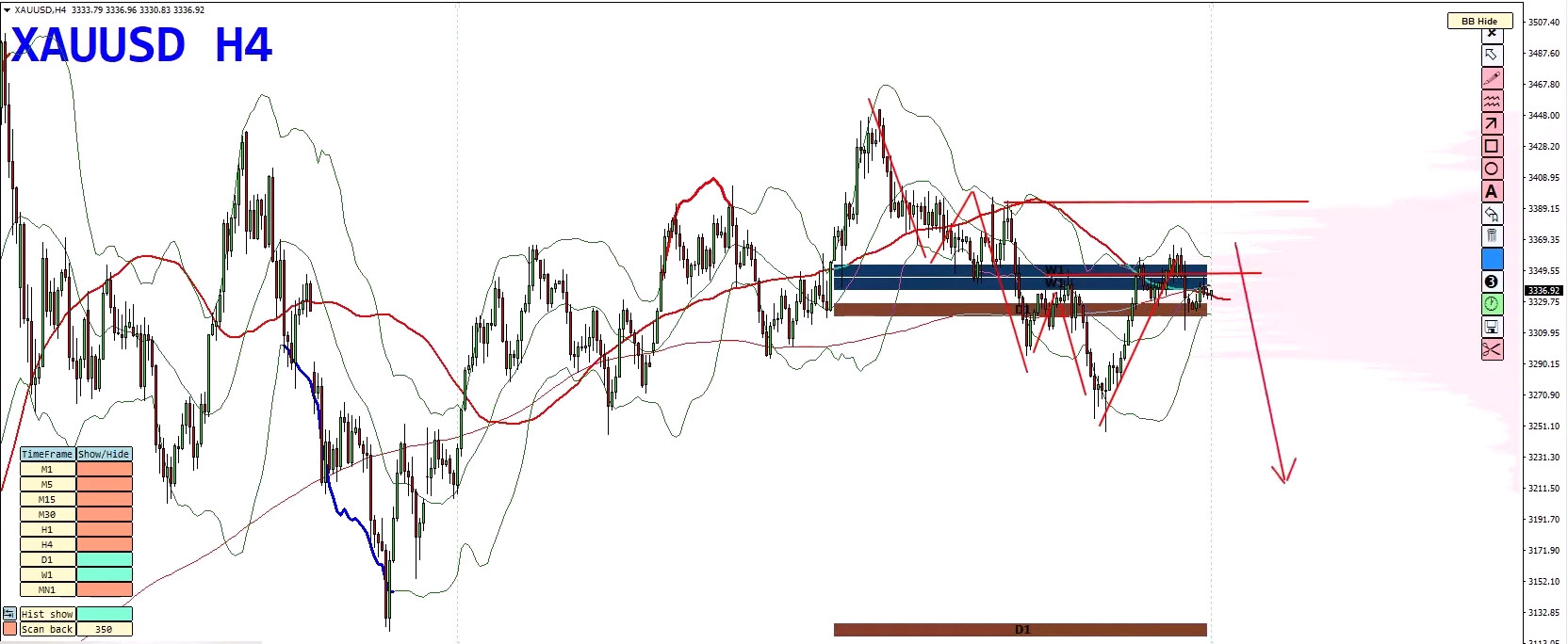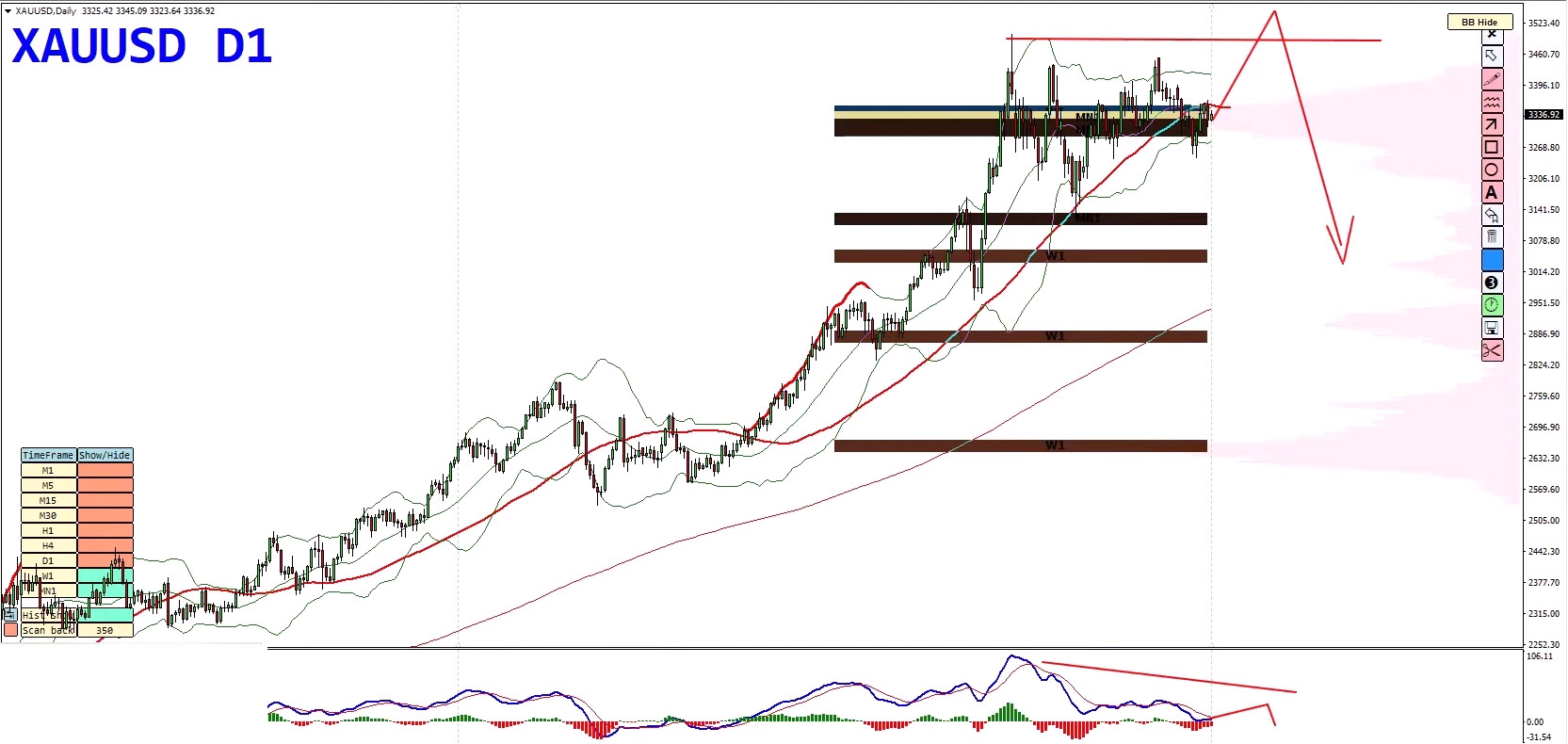 - Bollinger Band duplication marks this as a high-pressure area.