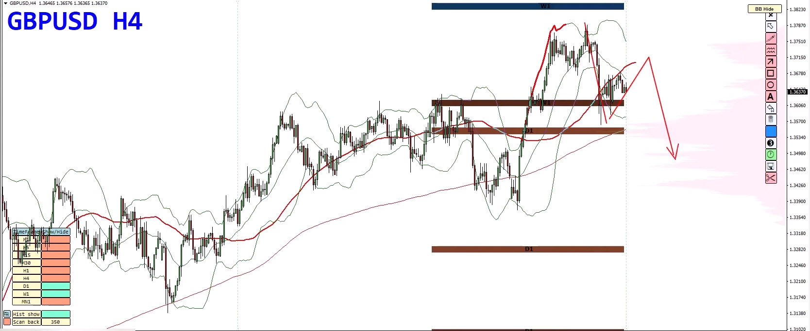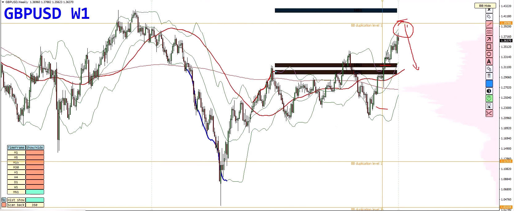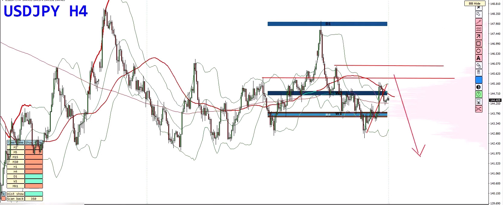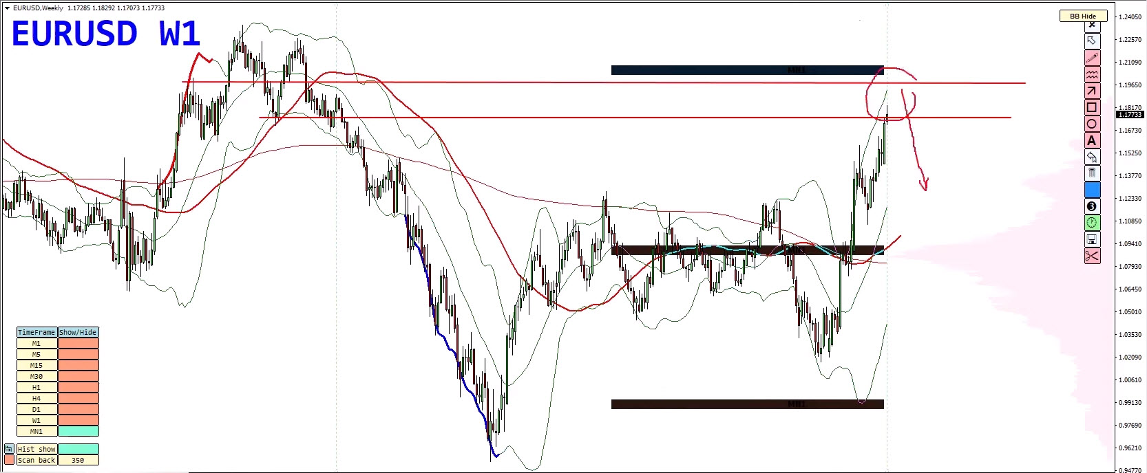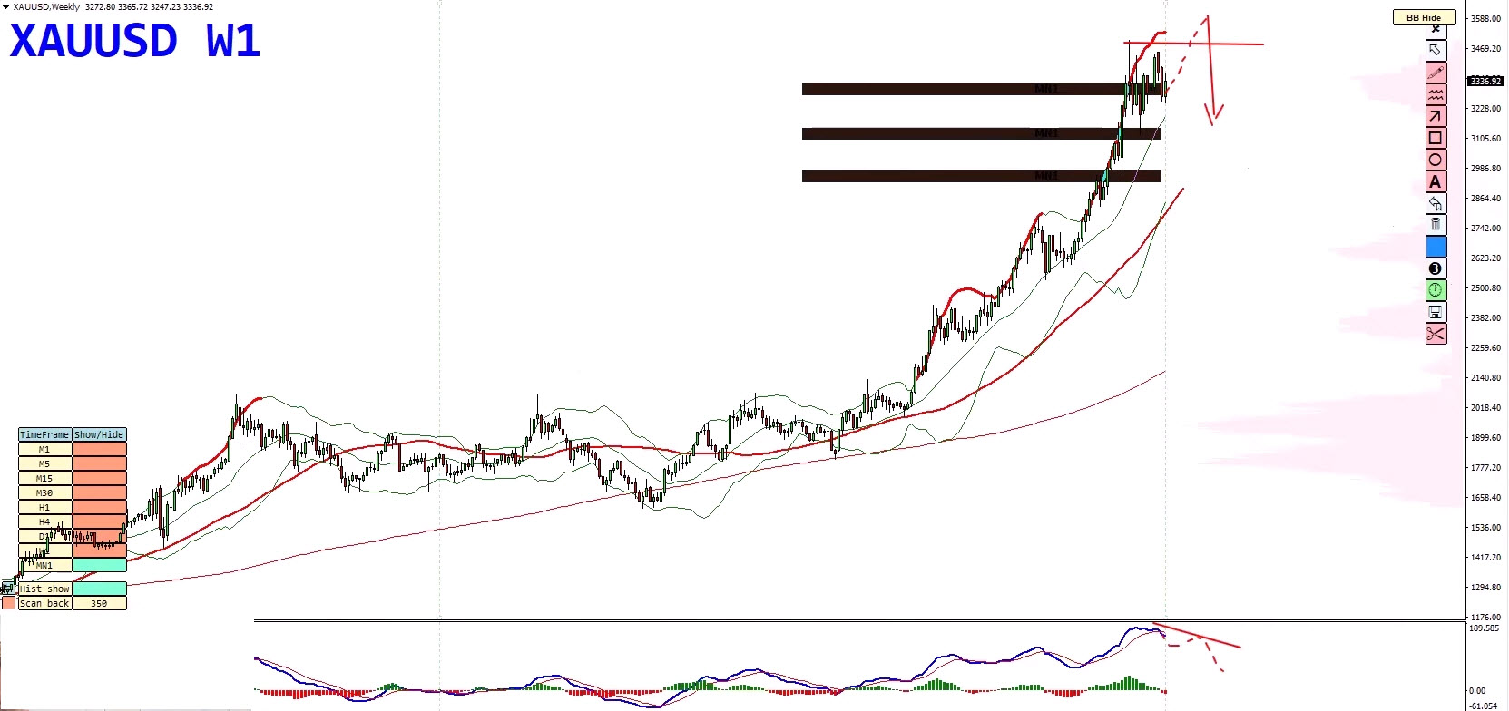 - Bollinger Band duplication marks this as a high-pressure area.
