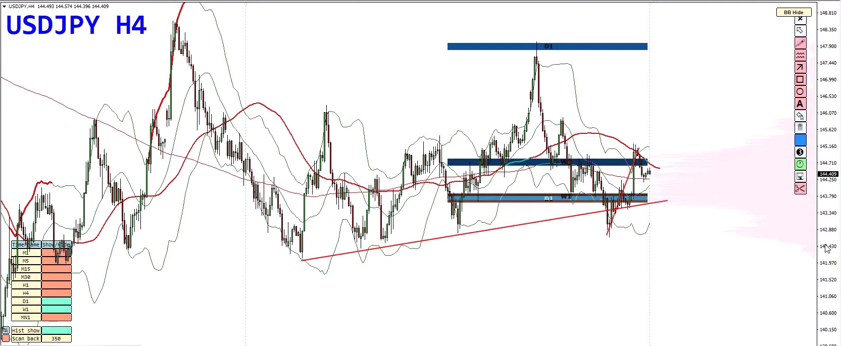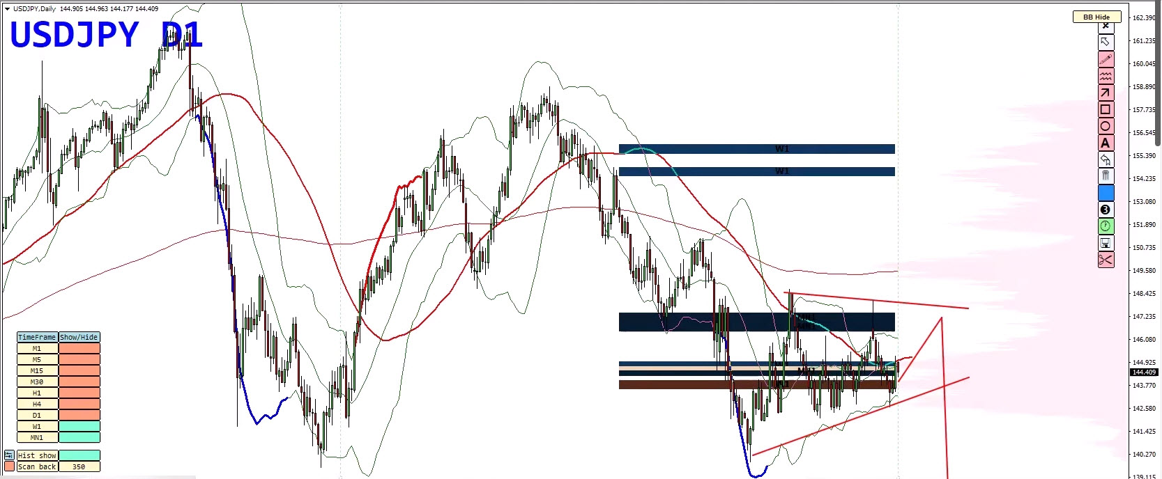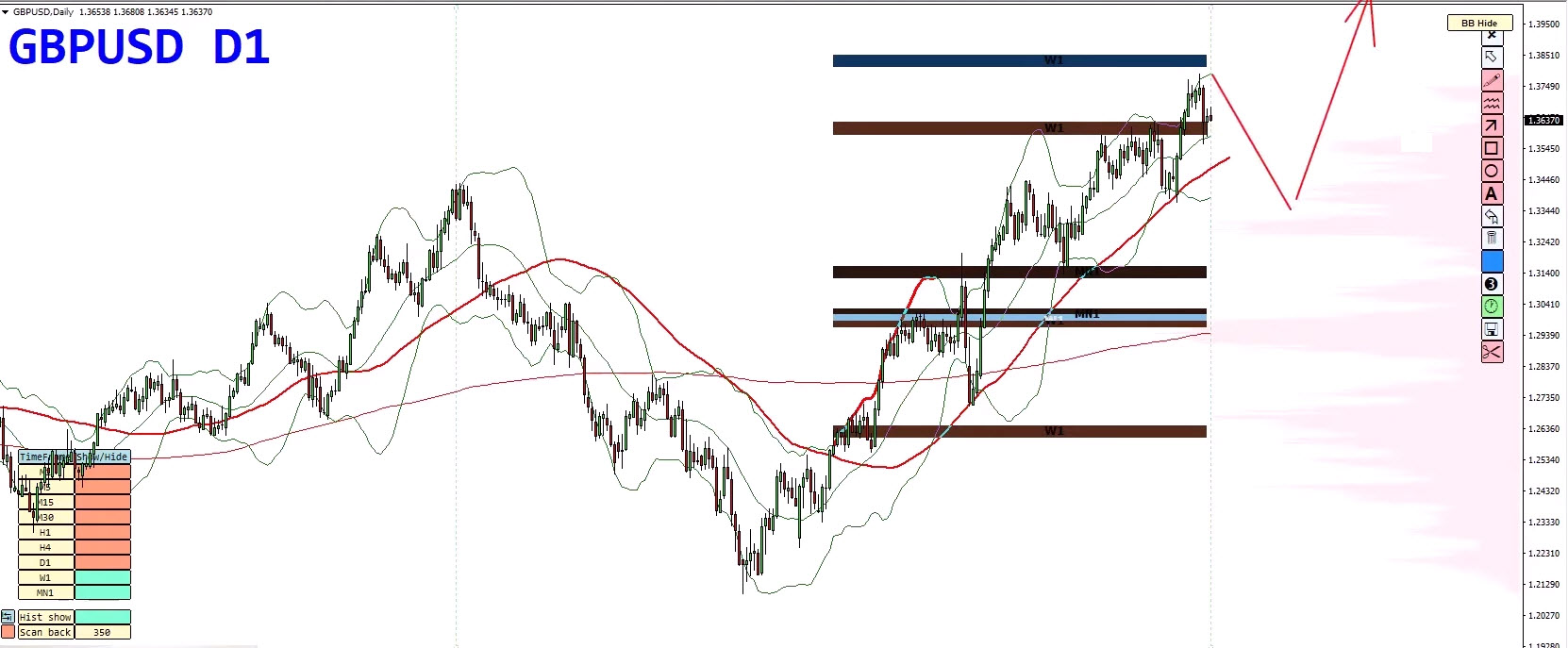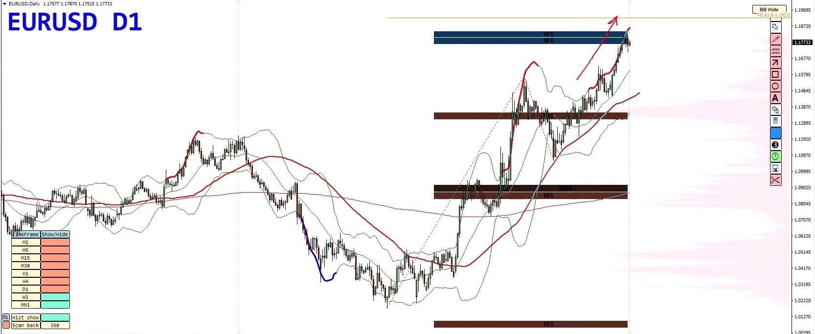 - Bollinger Band duplication marks this as a high-pressure area.