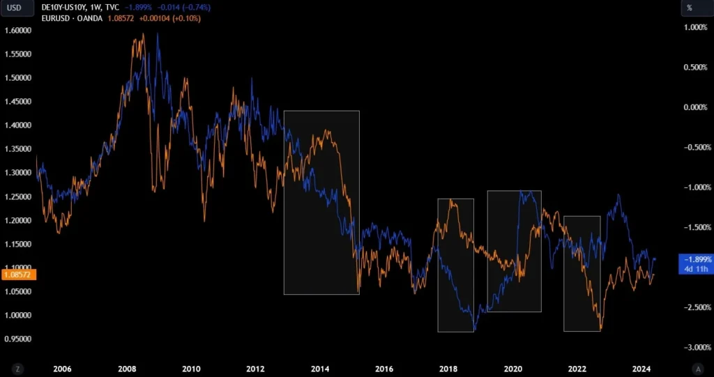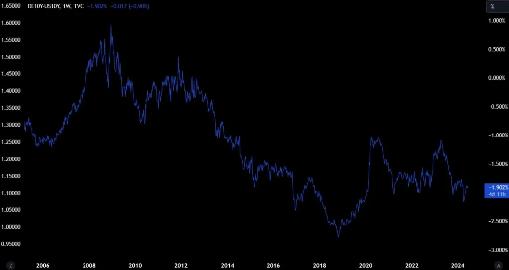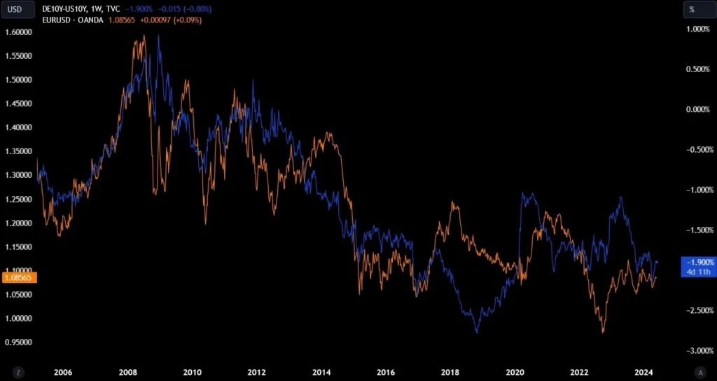 Traders can use this information to position themselves advantageously. For instance, if U.S. bond yields consistently rise above those of German bonds, the widening yield spread suggests a stronger USD in the future. Traders might enter long positions on the USD, expecting its value to appreciate. Conversely, if German bond yields begin to rise while U.S. yields stagnate, the narrowing spread might indicate a strengthening EUR. Traders could then position themselves to benefit from the anticipated rise in the euro’s value.