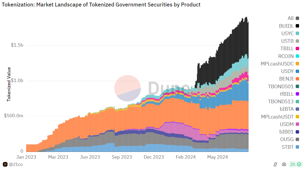 The fund was once the largest in this niche until BlackRock’s BUIDL fund joined the game, which leads the market with over US$500 million (AU$758.31 million) in assets under management (AUM), or 28.4% market share. In the second and third spots are US Yield Coin (USYC) and US T-Bill (USTB), according to data from Dune.