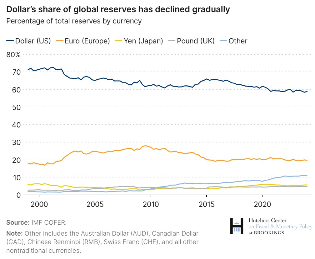 The U.S. dollar’s global share of global FX reserves has dropped from 72% in 2000 to 58% today. The USD is still dominant, contributing to about 50% of global transactions; however, investors are diversifying away from USD exposure amid rising tariffs and political volatility. In contrast, EURUSD broke out of its multi-month base as Eurozone GDP surprised to the upside while U.S. growth turned negative. The dollar’s relative strength narrative is cracking under the weight of structural trade shifts, fiscal imbalances, and softer Fed guidance. Expect continued capital flows into alternatives as BRICS currencies and gold gain reserve share.