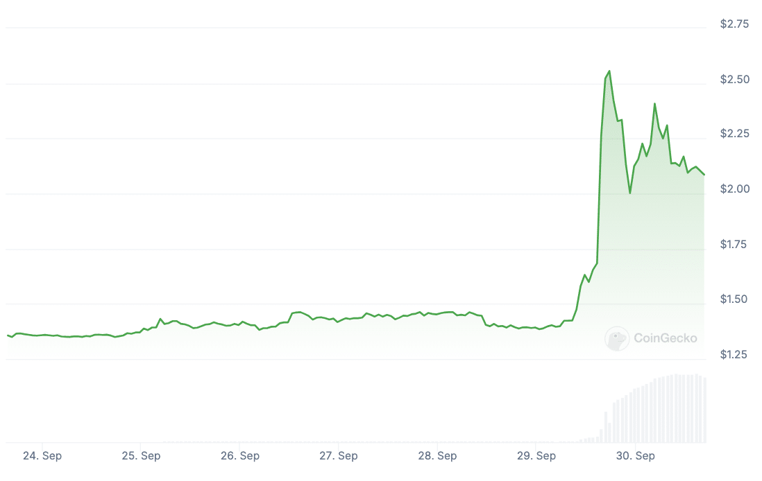 At its peak on Sep. 29, the FTX token (FTT) had gained 113% in a day. By the end of the day, the price had corrected and eventually dropped to $2.11 at the time of writing.