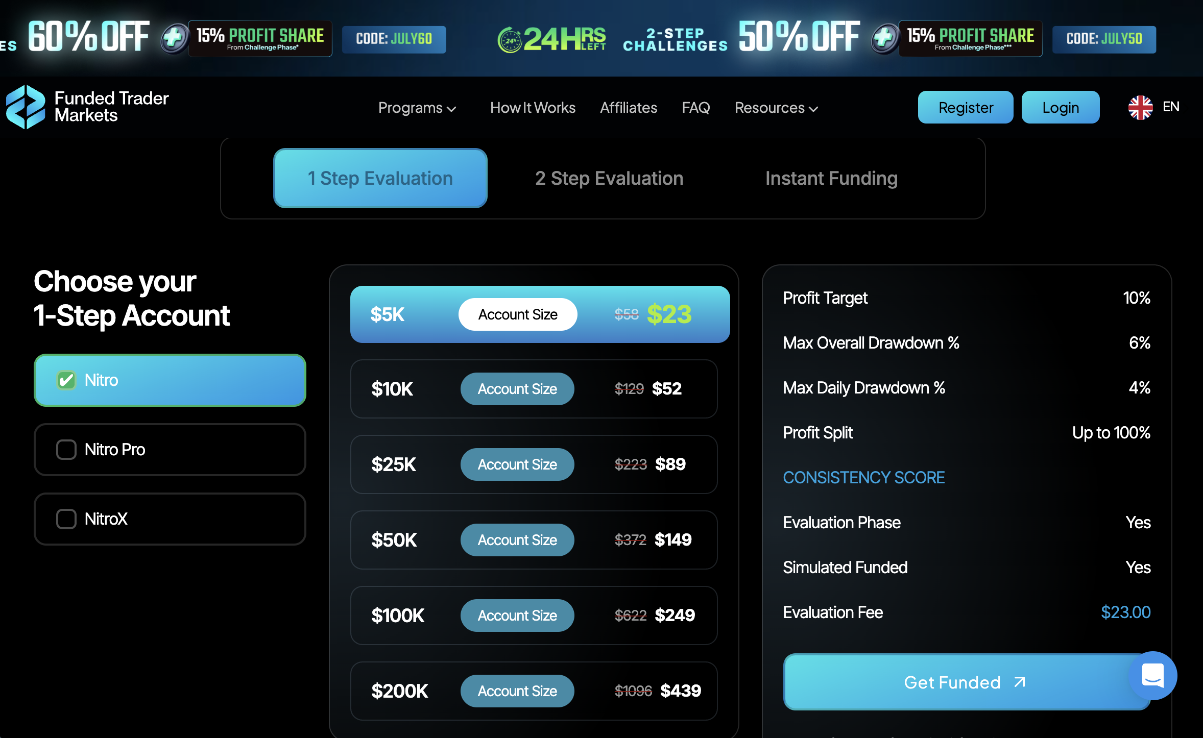 Funded Trader Markets has some of the most reasonable evaluation pricing in the industry. The 1-Step Nitro Pro challenge costs US$39 for a $5k account and scales up to $672 for a $200k account. The Nitro basic plan ranges from $58 to $1,096 based on account size.