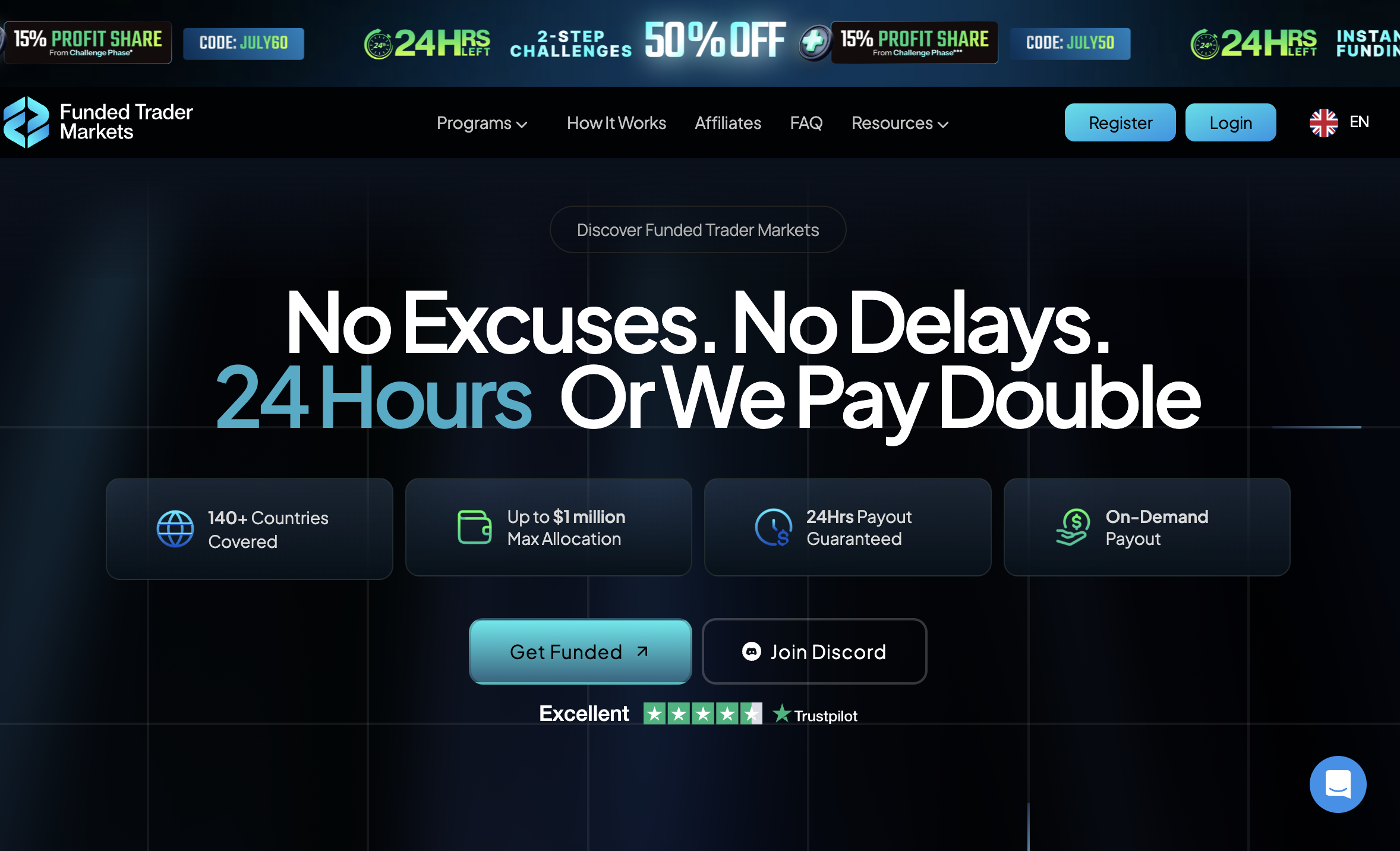 Funded Trader Markets stands out on its trading journey for its flexibility and speed, which many organizations lack. Traders can now receive on-demand payouts without having to wait 14 days, and the firm even guarantees a payout within 24 hours, or they will double it. According to reports , the majority of rewards arrive in less than two hours. Traders are paid promptly once profits are realized, and the firm is known for paying traders quickly and reliably.