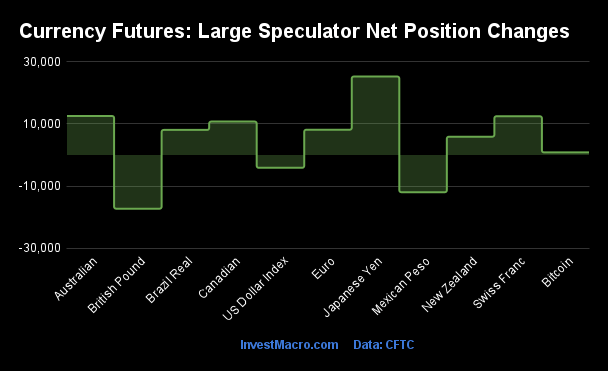 The currencies seeing declines in speculator bets on the week were the British Pound (-17,316 contracts), the Mexican Peso (-11,998 contracts) and with the US Dollar Index (-4,128 contracts) also recording lower bets on the week.