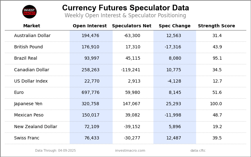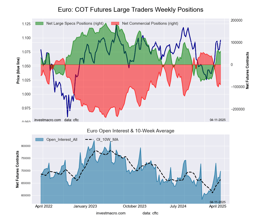 The latest COT data is updated through Tuesday April 8th and shows a quick view of how large market participants (for-profit speculators and commercial traders) were positioned in the futures markets. All currency positions are in direct relation to the US dollar where, for example, a bet for the euro is a bet that the euro will rise versus the dollar while a bet against the euro will be a bet that the euro will decline versus the dollar.