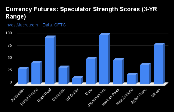 COT Strength Scores (a normalized measure of Speculator positions over a 3-Year range, from 0 to 100 where above 80 is Extreme-Bullish and below 20 is Extreme-Bearish) showed that the Japanese Yen (100 percent) and the Brazilian Real (95 percent) lead the currency markets this week. Bitcoin (80 percent) and the EuroFX (52 percent) come in as the next highest in the weekly strength scores.