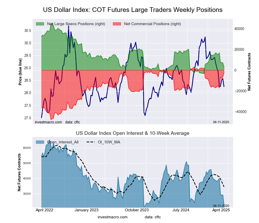 The US Dollar Index large speculator standing this week was a net position of 2,913 contracts in the data reported through Tuesday. This was a weekly decrease of -4,128 contracts from the previous week which had a total of 7,041 net contracts.