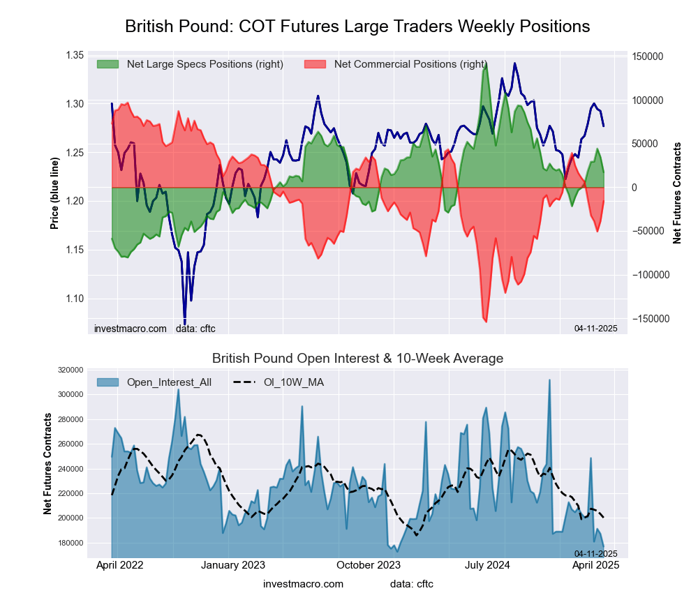 The British Pound Sterling large speculator standing this week was a net position of 17,310 contracts in the data reported through Tuesday. This was a weekly decline of -17,316 contracts from the previous week which had a total of 34,626 net contracts.