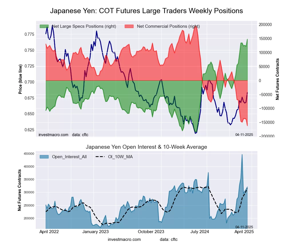 The Japanese Yen large speculator standing this week was a net position of 147,067 contracts in the data reported through Tuesday. This was a weekly increase of 25,293 contracts from the previous week which had a total of 121,774 net contracts.