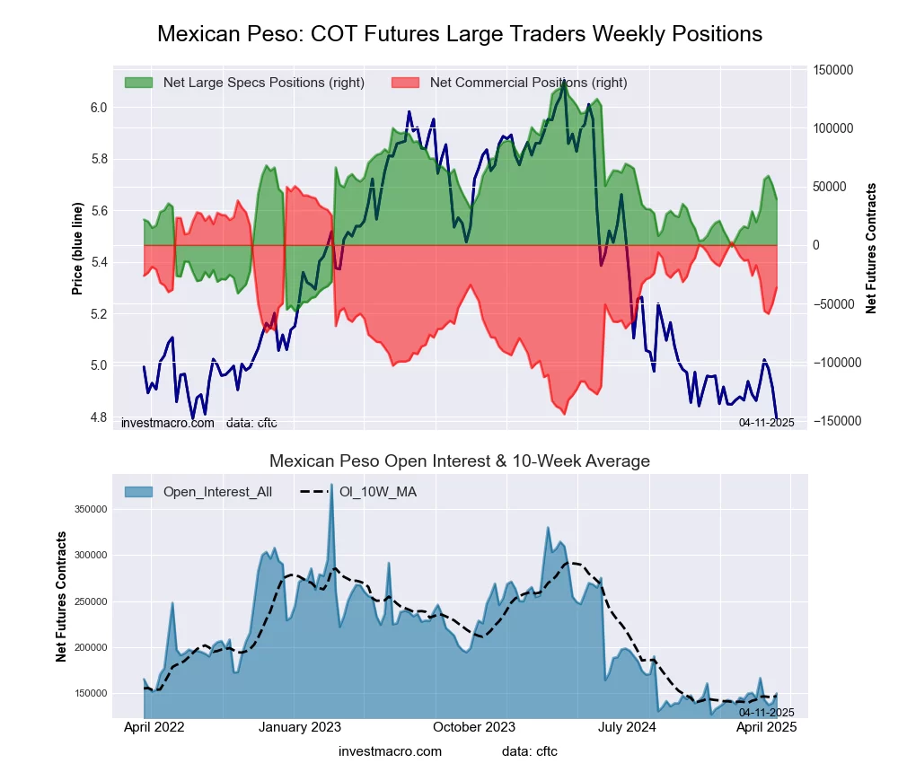 The Mexican Peso large speculator standing this week was a net position of 39,082 contracts in the data reported through Tuesday. This was a weekly lowering of -11,998 contracts from the previous week which had a total of 51,080 net contracts.