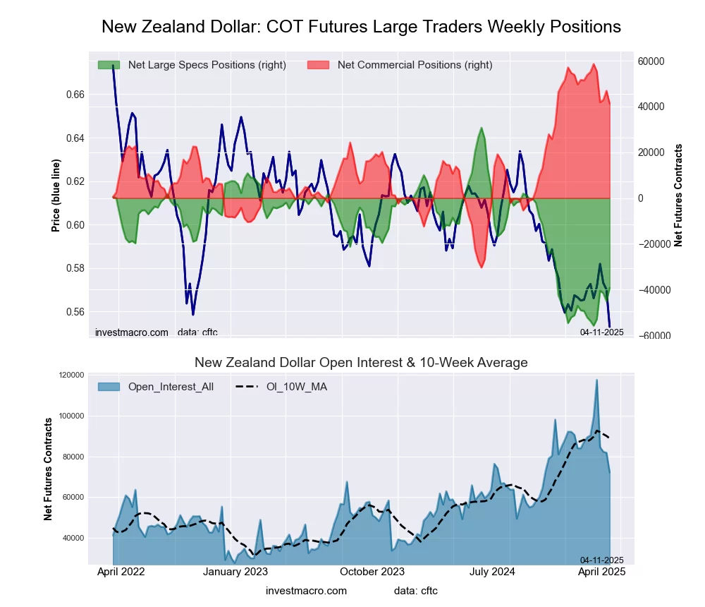 The New Zealand Dollar large speculator standing this week was a net position of -39,152 contracts in the data reported through Tuesday. This was a weekly increase of 5,896 contracts from the previous week which had a total of -45,048 net contracts.