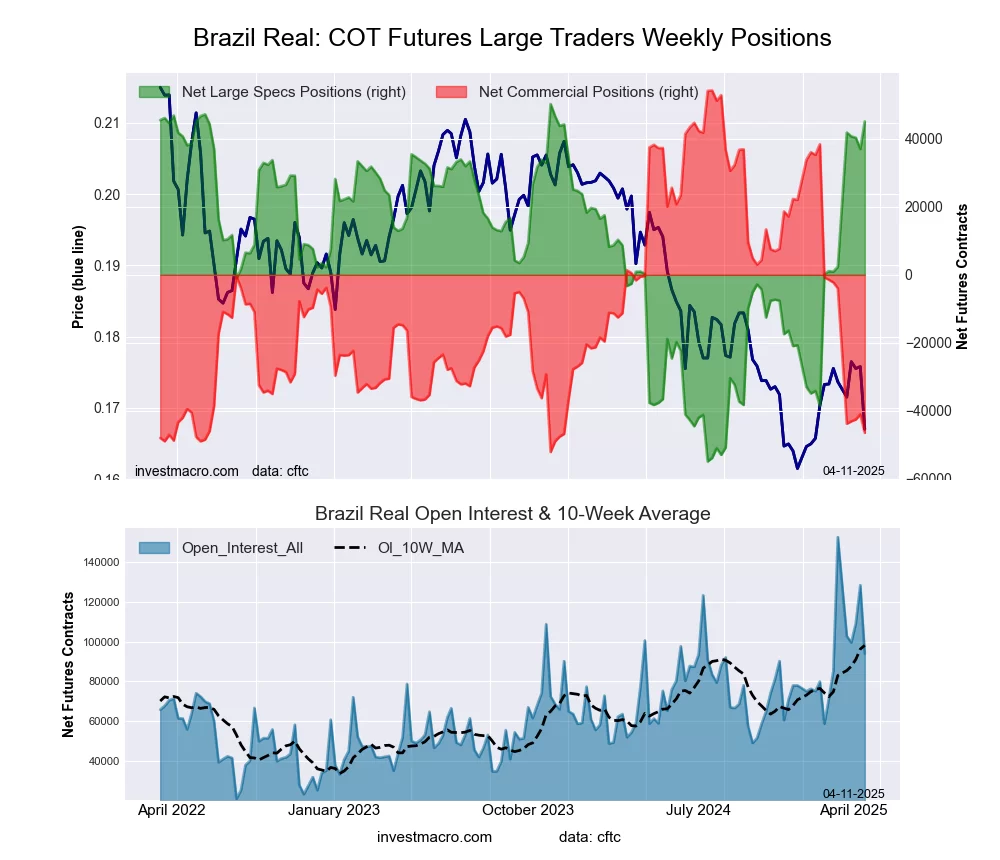The Brazilian Real large speculator standing this week was a net position of 45,115 contracts in the data reported through Tuesday. This was a weekly boost of 8,080 contracts from the previous week which had a total of 37,035 net contracts.