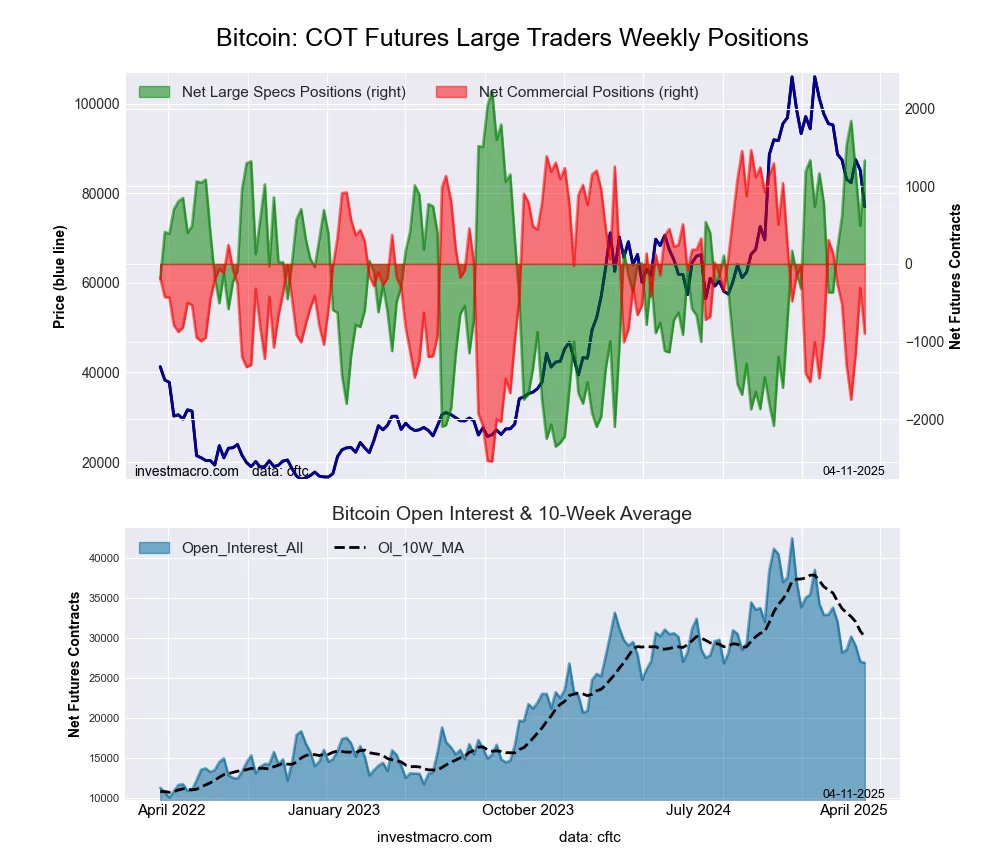 The Bitcoin large speculator standing this week was a net position of 1,332 contracts in the data reported through Tuesday. This was a weekly gain of 841 contracts from the previous week which had a total of 491 net contracts.