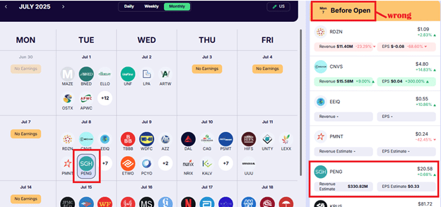 And Penguin Solutions (PENG) would correctly appear in the calendar for Tuesday, July 8…