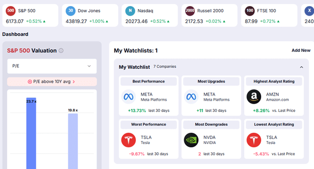 The Watchlist section will inform you if there are any analyst upgrades/downgrades on your watched stocks and tell you how many days till their next earnings announcement.