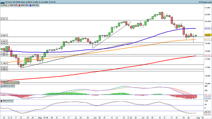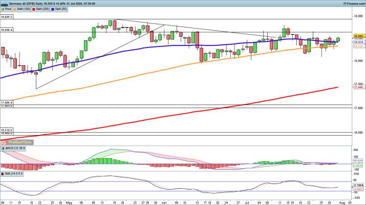 After dipping below the 100-day simple moving average (SMA) yesterday, the Dax has regained strength, continuing its upward movement from the past two months. While substantial gains have been challenging to maintain, an initial target is 18,600, followed by the July high at 18,750. Beyond this, the May high at 18,935 is within reach.