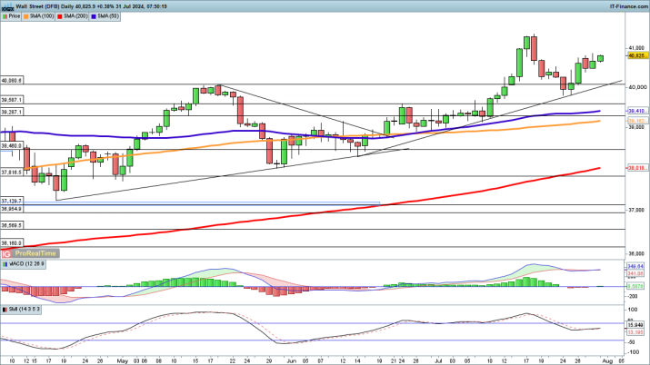 The Dow continues its recovery, with the lower weighting of tech stocks now serving as a benefit rather than a hindrance, as it had been for much of the year. After climbing back above 40,000 last Friday, the index has gained further ground, approaching the 41,000 level and the record high set earlier in July.
