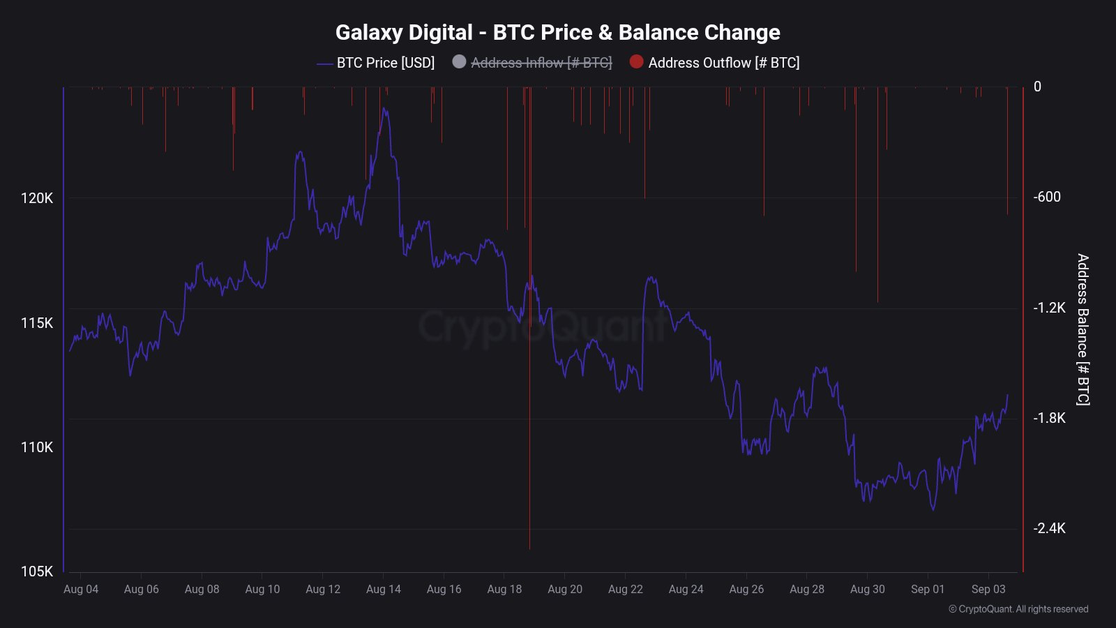 The concern appears valid. Charts show that Galaxy Digital wallets consistently recorded multiple outflows over the past month, ranging from over 2,400 BTC to 600 BTC. Meanwhile, Bitcoin’s price trended lower in August.