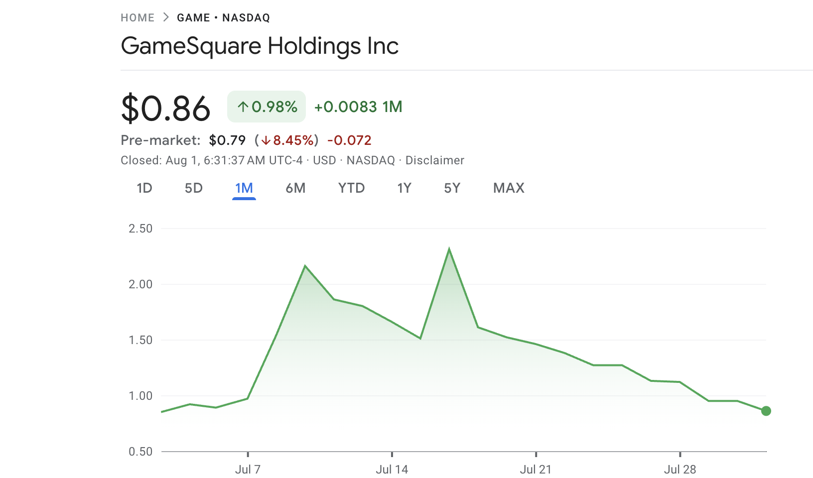 Within two days of announcing its ETH treasury, GAME surged by approximately 189.90%. The price reached $2.87, a level not seen since August 2023. Nevertheless, the rise was short-lived, and GAME erased nearly all its July gains.