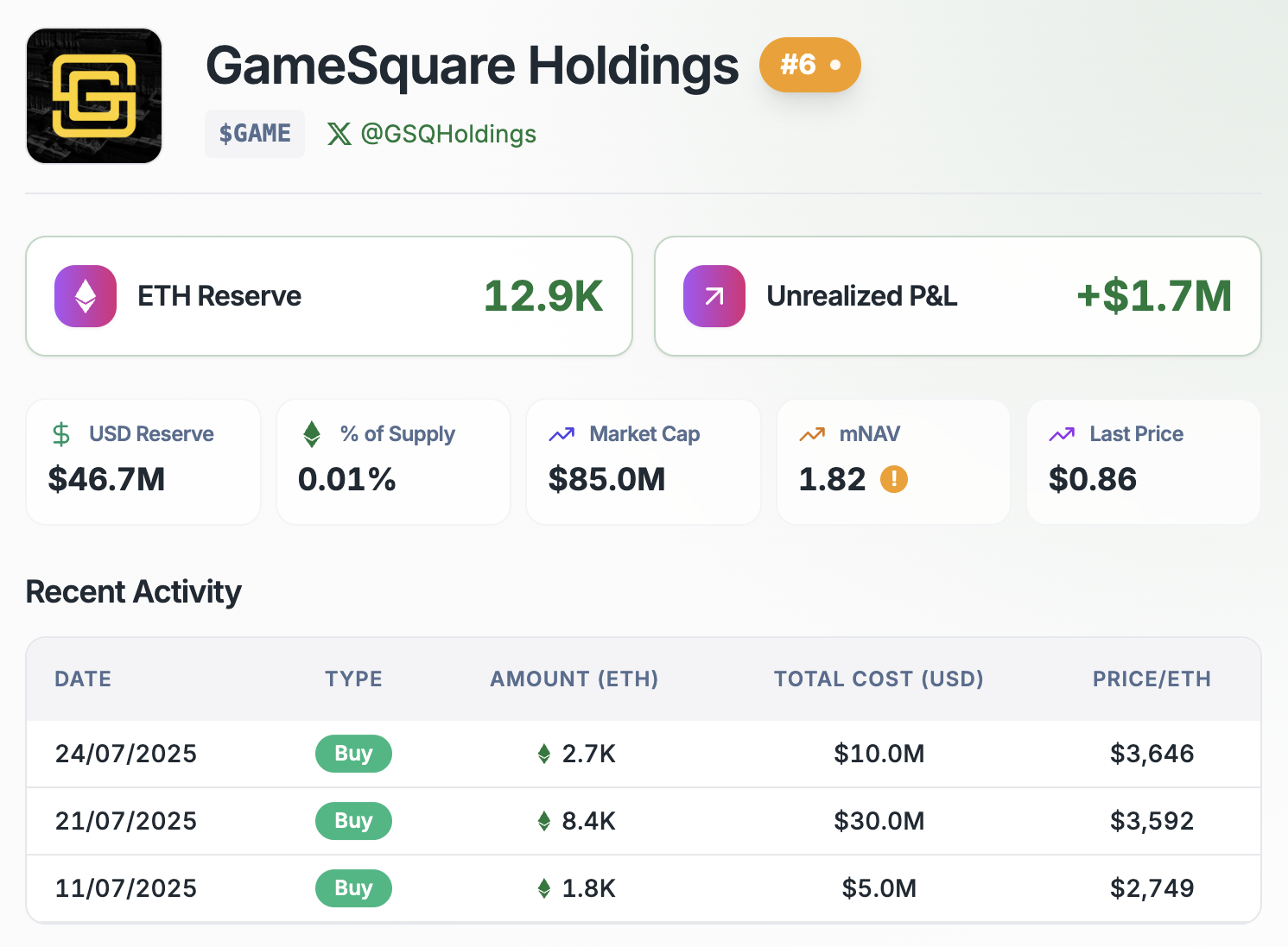 Data from Strategic ETH Reserve showed that GameSquare acquired around 12,900 ETH between July 11 and 24, making it the sixth-largest public holder.