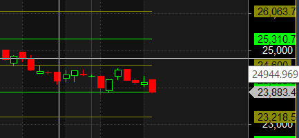 Currently, the price is back to its 3×4 Gann angle support, and breaking below this support for two consecutive days could open up further downside potential, possibly towards 23,000.