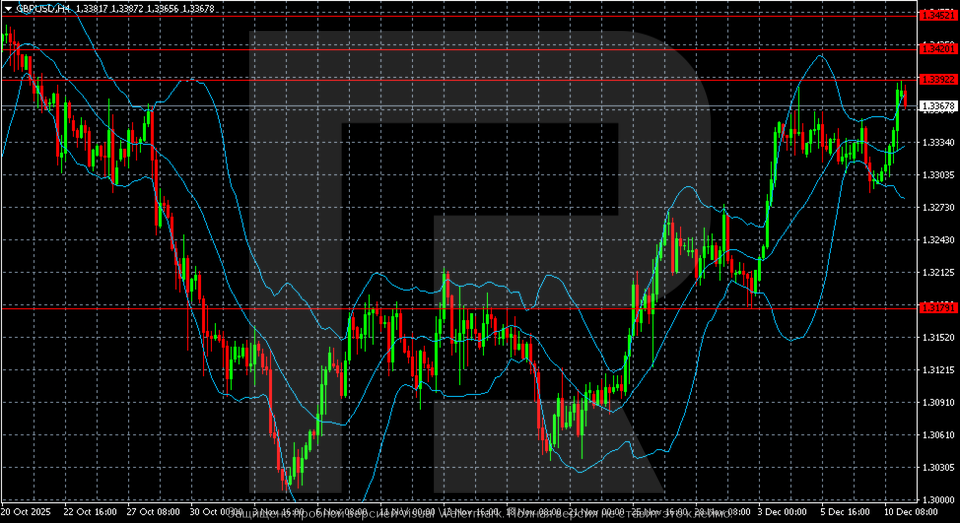 On the H4 chart, GBP/USD exhibits a strong upward bias, trading just below the key technical resistance at 1.3392. The pair’s position firmly above the middle Bollinger Band confirms the dominance of buyers. The expansion of the upper band signals rising volatility and suggests the market is building momentum for another attempt to breach this barrier.