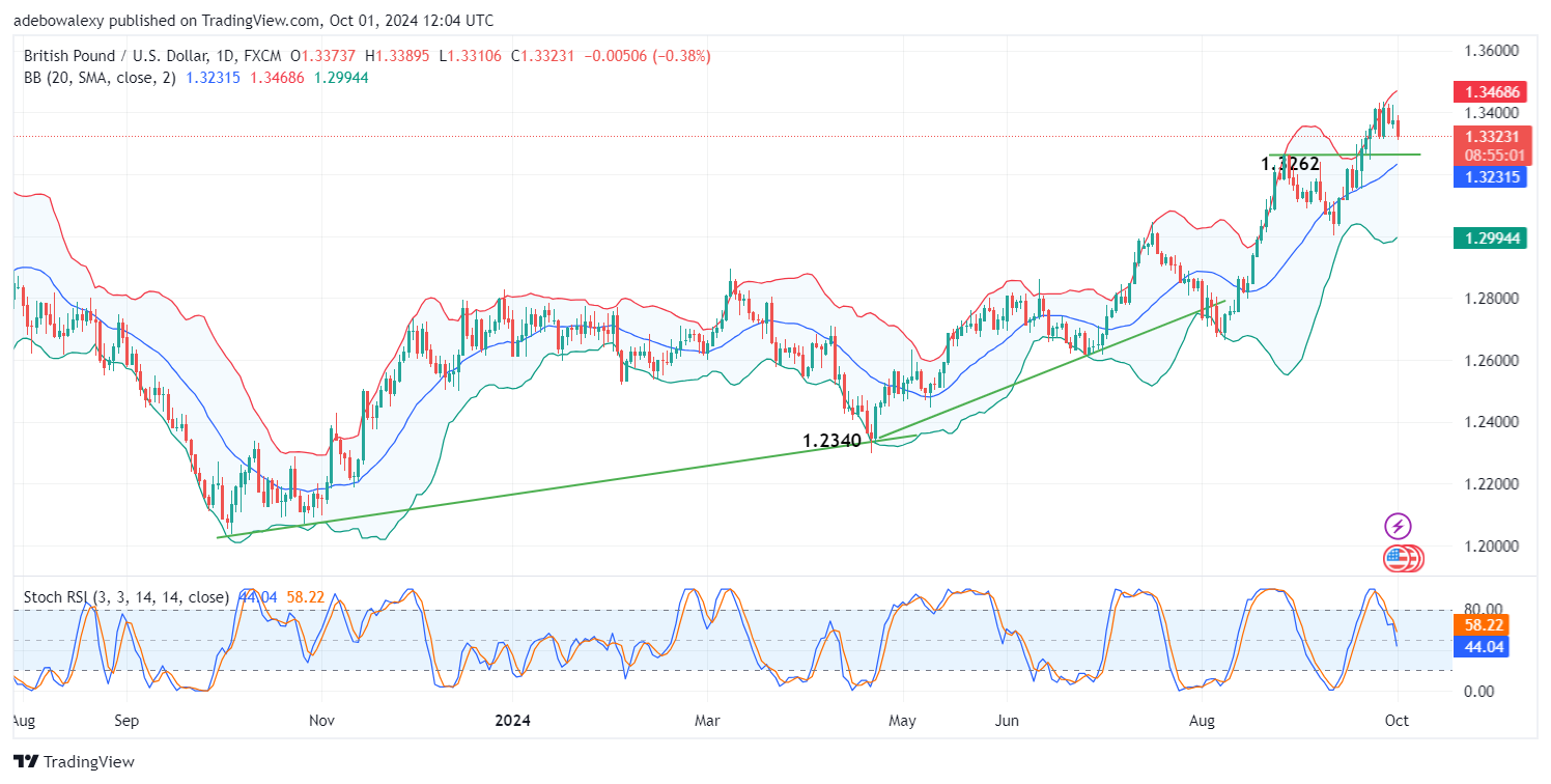 This, combined with market sentiment, has produced a moderate downward price retracement. Despite the retracement, it can be observed that the pair still trades above the middle line of the Bollinger Bands (BB) indicator. Also, the Stochastic Relative Strength Index lines can be seen trending downward toward the oversold region.