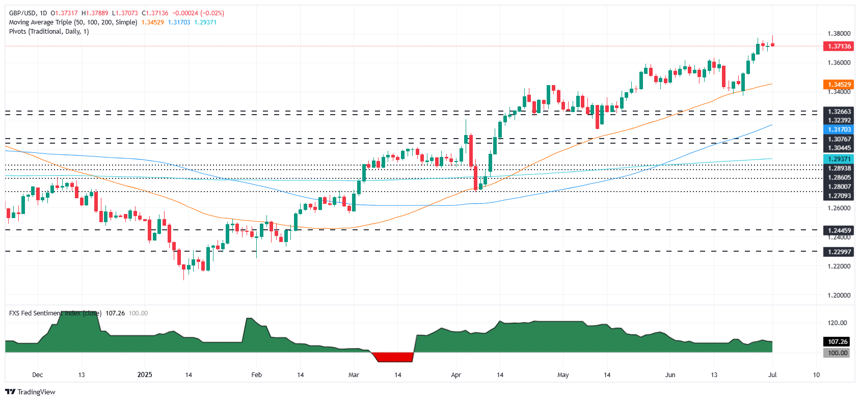 - GBP/USD slips 0.07% after hitting 1.3788; stalls just shy of psychological 1.3800 level.