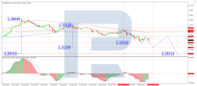 On the H4 GBP/USD chart, the market is forming a wide consolidation range around the 1.3326 level, currently extending up to 1.3393. A decline to 1.3131 is expected in the near term. Following this correction, a new consolidation phase is likely. An upside breakout would pave the way for the wave to extend to 1.3410, while a downside breakout would suggest further movement towards 1.2971. This scenario is confirmed by the MACD indicator, which shows its signal line below the zero line and pointing firmly downwards.