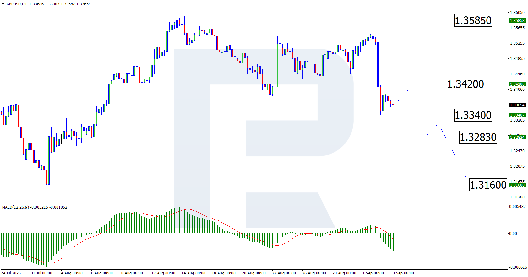 GBP/USD completed a downward wave towards the 1.3340 USD level. A corrective wave towards the breached support level of 1.3420 USD – now likely to act as resistance – may follow. Once this correction concludes, the pair could resume its decline, with initial support expected at 1.3340 USD, followed by a further drop towards 1.3283 USD, where another corrective wave may form. This bearish outlook is supported by the MACD indicator, where both the histogram and signal line remain below zero and continue trending downward.