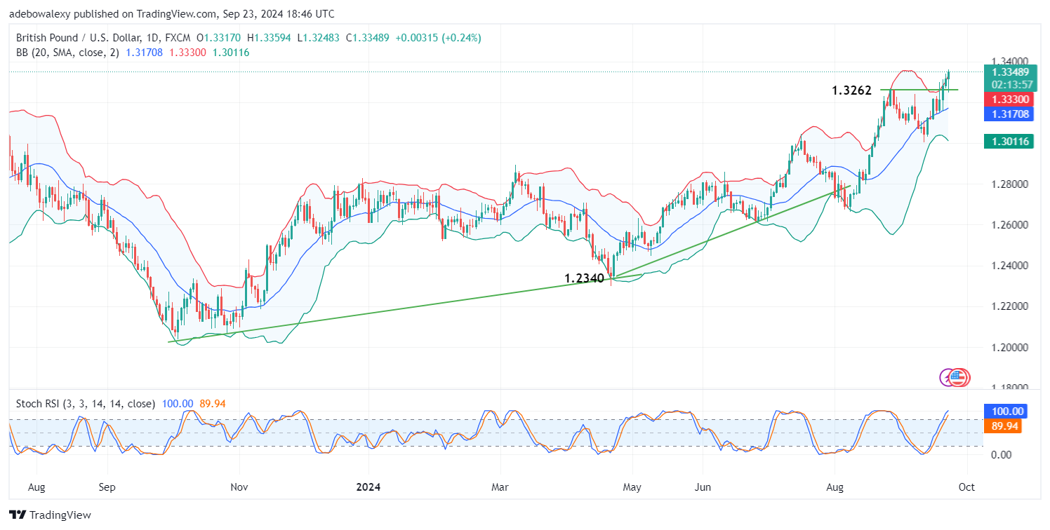The persistent US dollar weakness has continued to fuel upside corrections in the GBPUSD market. The market broke the resistance at the 1.3262 price level during the past two sessions. As a result, the subsequent two sessions have continued to trade above the 1.3262 threshold, with the market now tending toward the 1.3400 threshold.